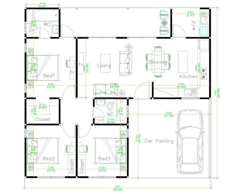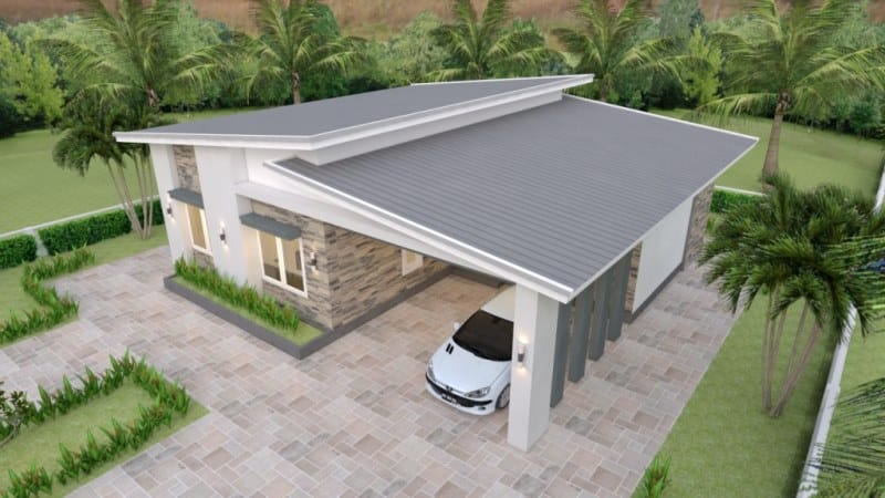 A very smart and functional layout, the living spaces occupying the right backside of the plan, offer better mobility in a free-flowing concept. Meanwhile, the private zone of three bedrooms sits on the left portion of the design. On the other hand, the spacious inviting car park owns the front right corner of the house.