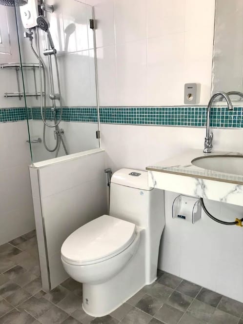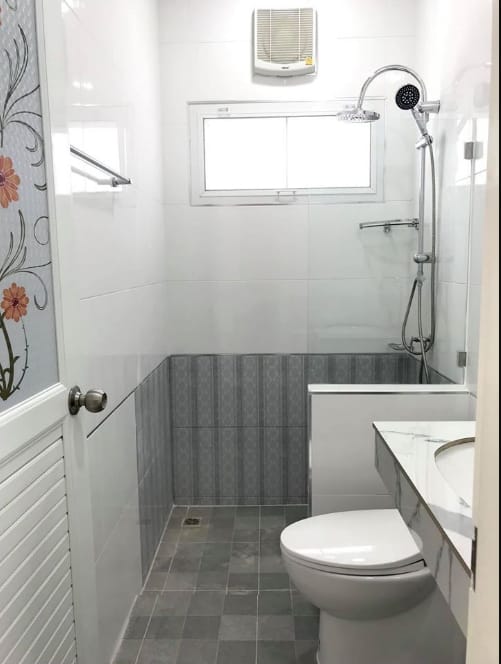 The bathroom looks really relaxing and well-kept. The dark floor tiles are just appropriate for the bathroom floor. Dark color will make dirt less noticeable.