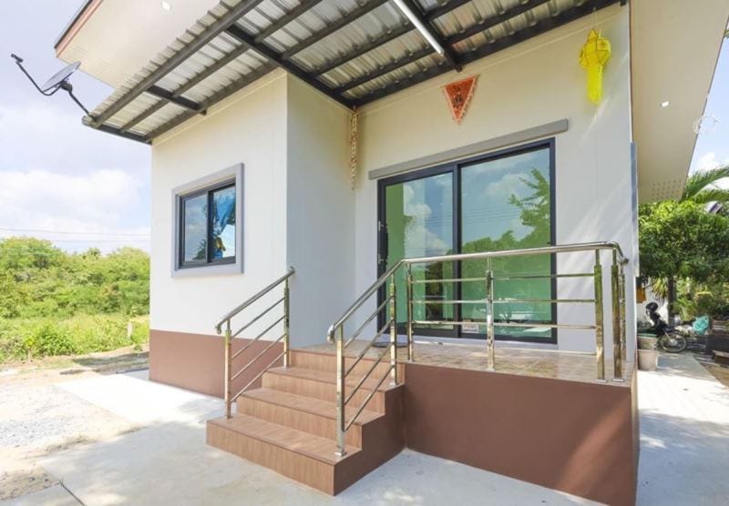 For purposes of ventilation, the unit has a design with green-tinted sliding glass doors and glass window panels in grey frames which are medium for the supply of light and air. By the way, the shed roof with grey sheets delivers an extra character to the house.