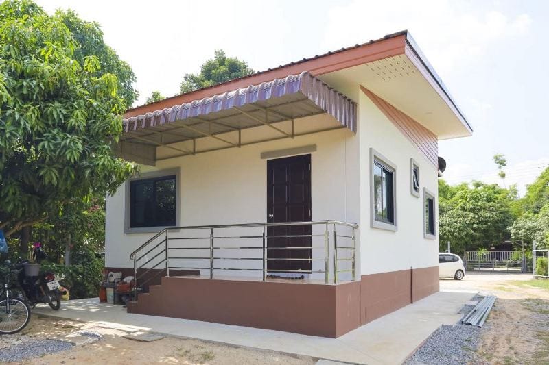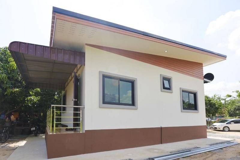 Showing a touch of modernism, the one storey house has a roof over a roof with flat ceiling ventilation. Additionally, the clerestory is in orange paint, while the bottom base is painted in a brown color. With the decoration of grey plaster cornice, the unit looks beautiful as well with the walls in a cream-colored shade