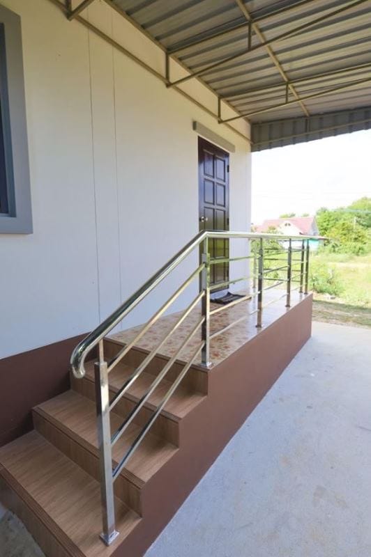 Meanwhile, there is a small terrace at the rear side with stainless steel railing as well and brown marble tiles covering the floor and stairs.