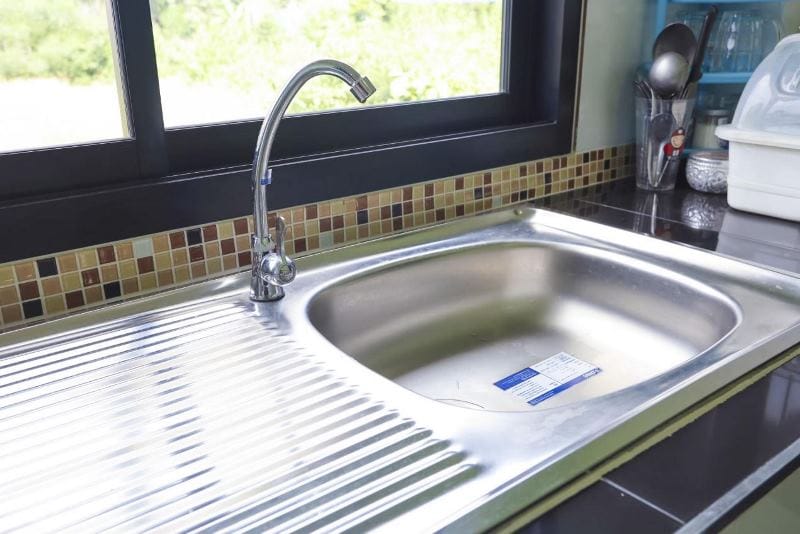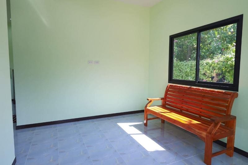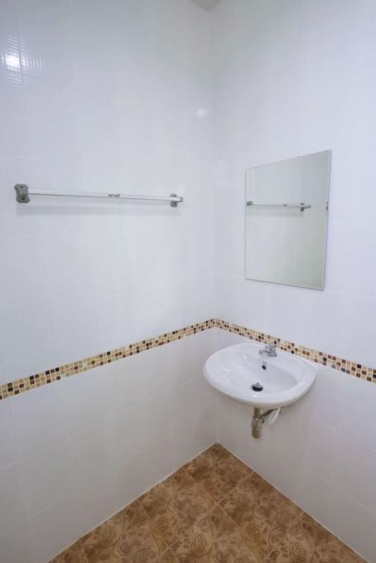 A modest house has also a simple well-ventilated kitchen with complete fixtures of countertop and sink with correspondingly simple wall tiles.