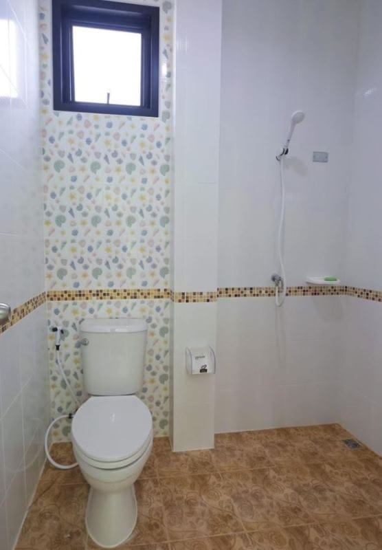 Meanwhile, the compact bathroom design is in white walls and beautiful tiles in cream color.