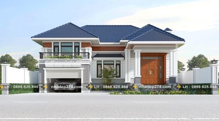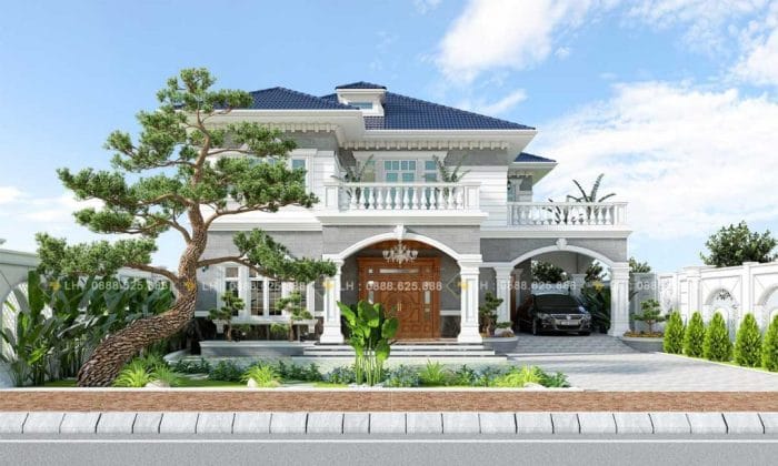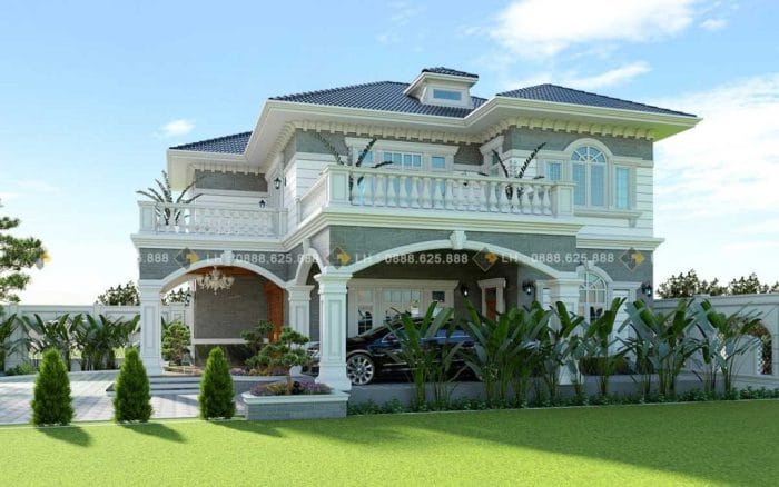 The roof style, balusters, pillars, door, and the intricate architectural features all make this house achieve its elegant look. The combination of white and gray paint for its bulk makes it look magnificent with the roof style and color.
