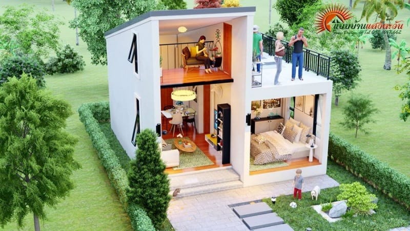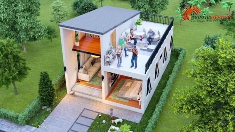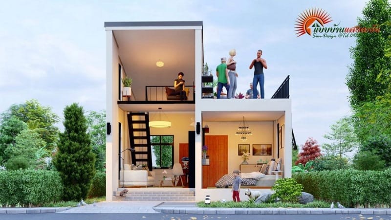 The ground floor contains both the living spaces and the private zone, combined in a compact design. Meanwhile, the second floor is utilized for a family room above the living room and an open balcony that serves as an extension of the living room for relaxation.