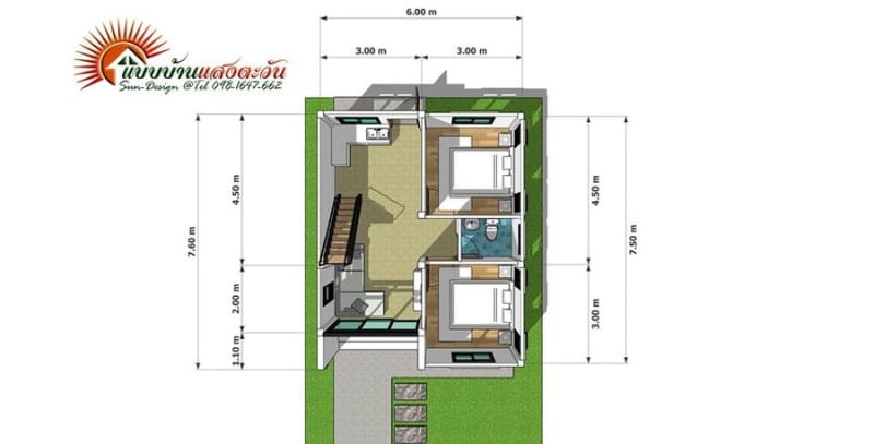 A compact design, it features a small porch at the main entrance that welcomes the living room through glass doors. The simple living spaces are in a free-flowing layout that settles at the left side of the plan. Meanwhile, the private zone with two bedrooms and a bathroom occupy the right section of the house.