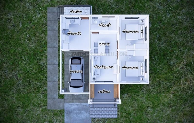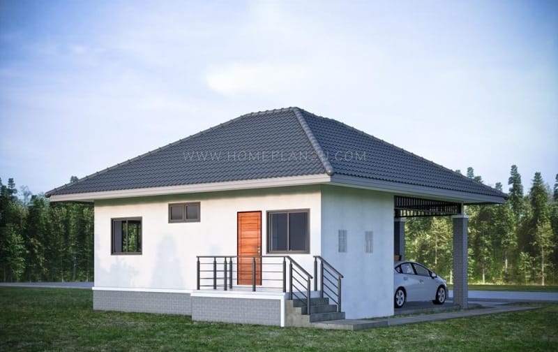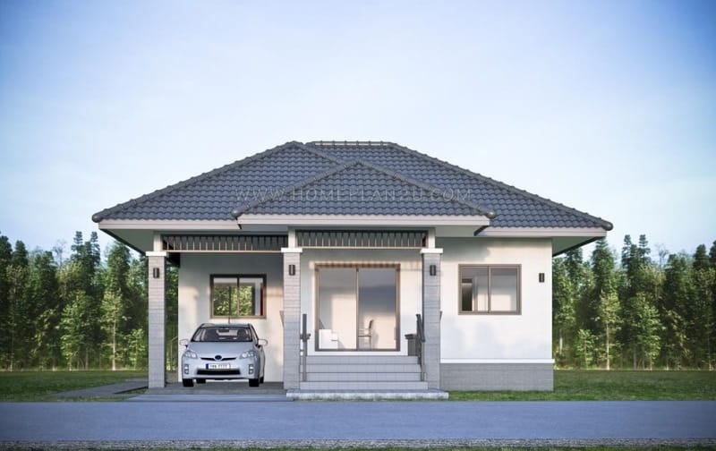 The floor layout is simple and straightforward but functional. An elevated porch is a perfect entrance to the living room through the glass door. The living spaces in a free-flowing concept are on the middle and left side, while the private zone occupies the right side of the plan. Meanwhile, the garage sits comfortably on the left corner of the house.