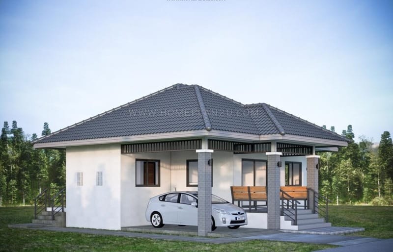 Meanwhile, one of the highlights of this design is the well-defined hip-style roof with grey clay tiles. The grey tiled porch, garage, and rectangular footpath match the roof that burst in character.