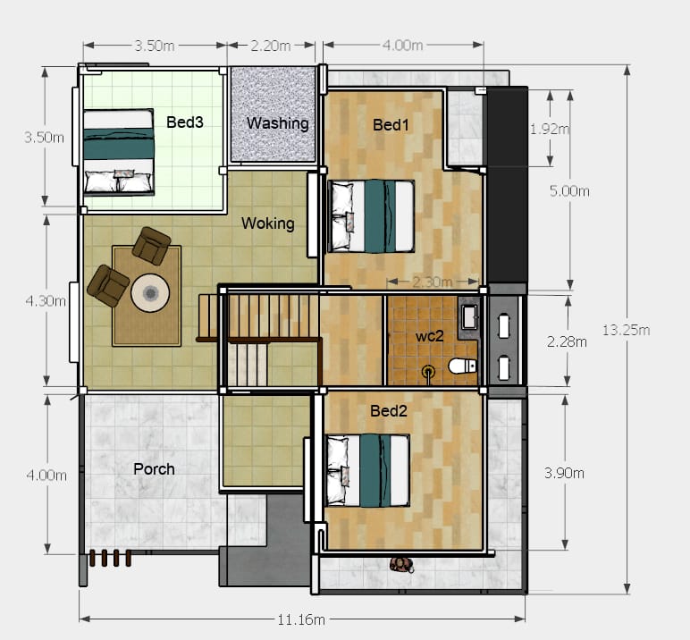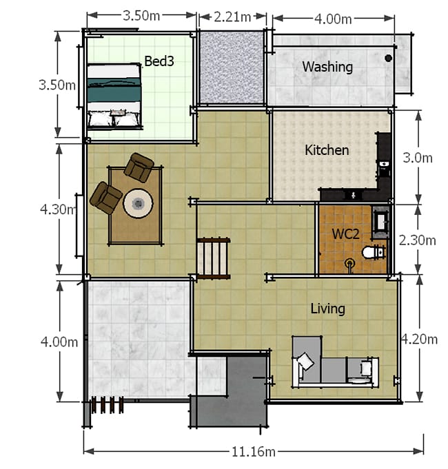 Upon entering the entry way, you can immediately see the spacious living room and dining hall on the ground floor. There is also a spacious kitchen and a common toilet and bath. This house also has a wide washing area that is connected to the storage room.