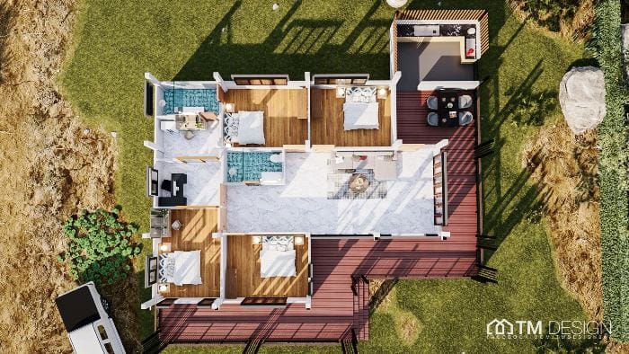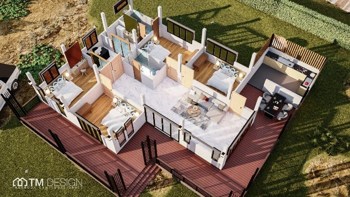 This is the top view of the floor plan. You can see how the veranda is built surrounding two thirds of the house. Many homeowners prefer this kind of design while many other would opt for a porch or a separate structure like a gazebo.
