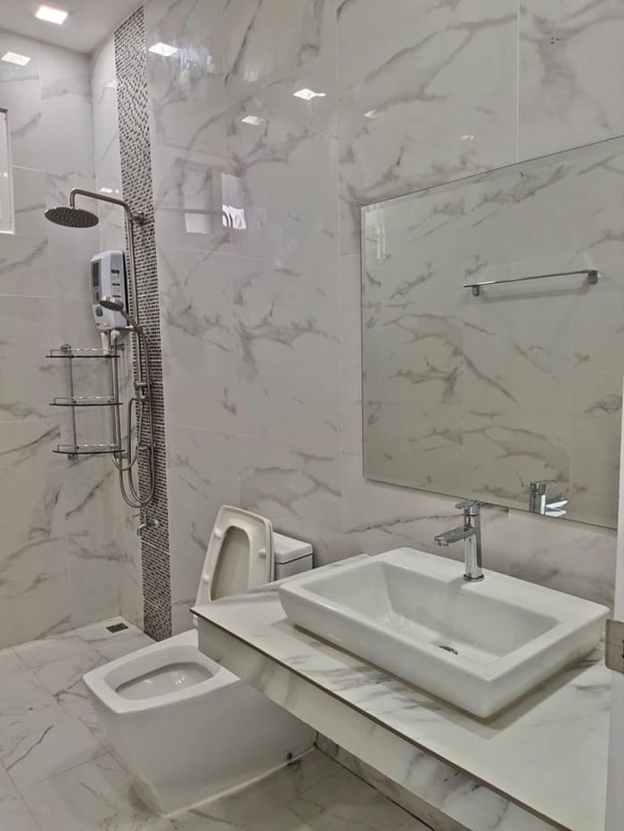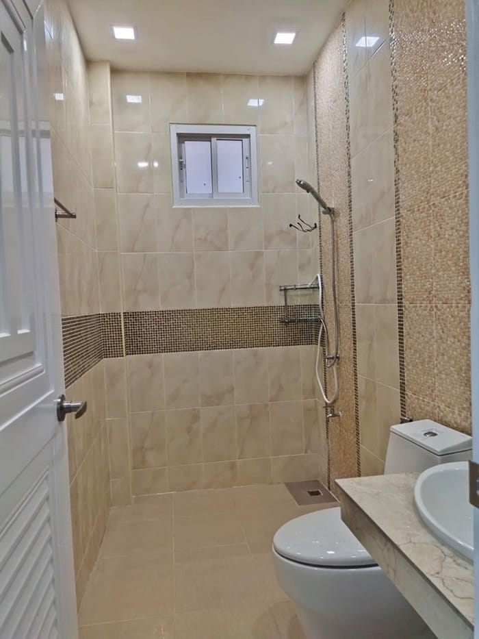 The bathroom looks so elegant and it spells luxury. The owner has picked the best design and color of the tiles that also matches the mood of the water element in the bathroom.