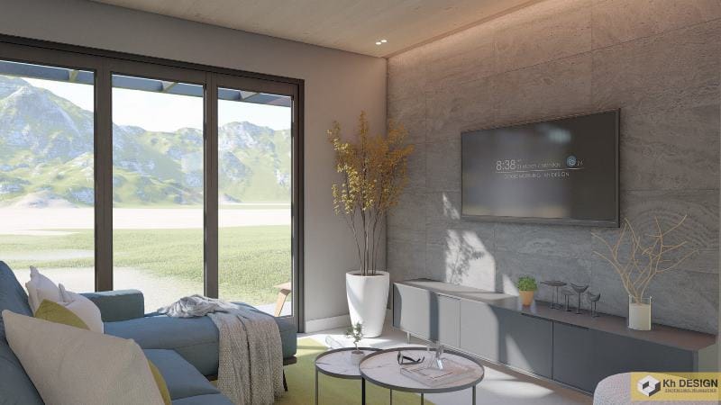 The Living Room in cream, grey, and light brown colors from floor to ceilings and furniture. The wall-sized glass offers great ventilation to the interior.