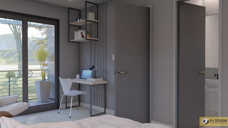 The third bedroom with grey walls delivering a pleasant connection with the soft-colored furniture and fixture.