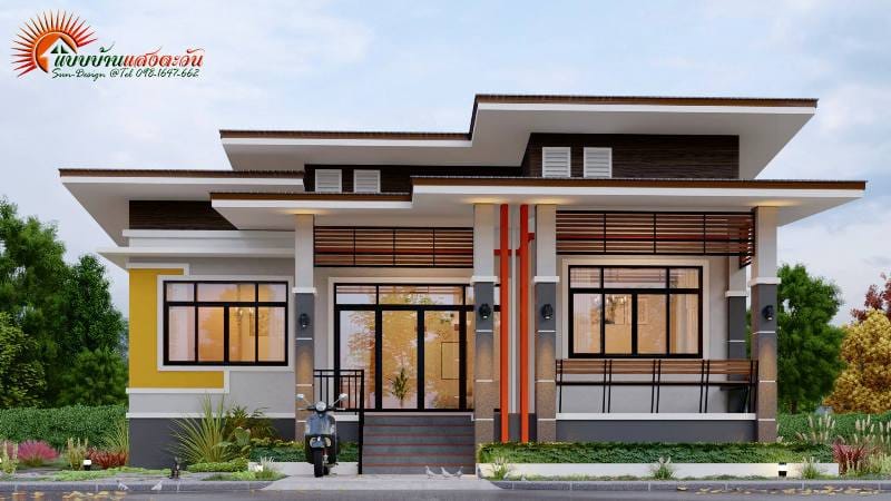 Its elevation gives it an aesthetic appeal. The straight lines, grooves, beams, and the color combination of gray and black are all characteristics of modern design well incorporated in this bungalow.