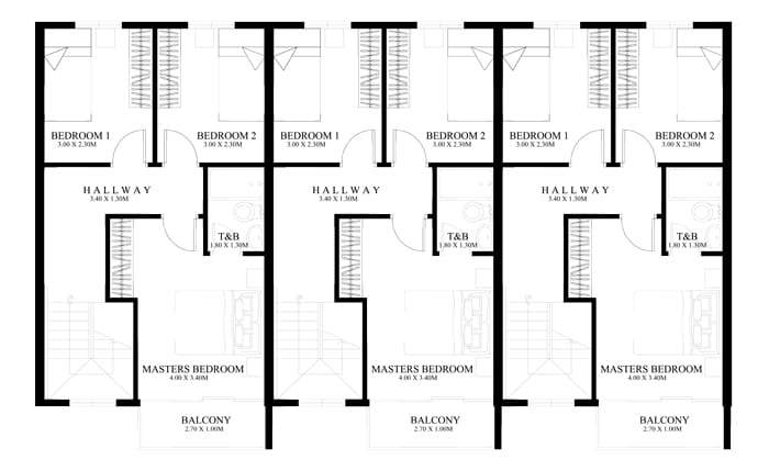 The second floor consists of the 2 standard bedroom at the rear equally divided width at 2.3 meters and 3 meters depth. At the front side is the master’s bedroom with en-suit bathroom. All the these rooms are designed to have built-in cabinets. A small balcony or terrace is also provided in the master’s bedroom to view the front.