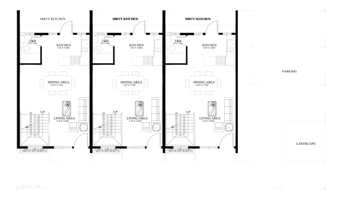 Townhouse Plans Series : PHP-2014011 is a 3 unit row house. Each unit is identical to the other 2 and consist of the following in the ground floor. The ground floor is an open ended style with living room, dining, kitchen and bathroom at the rear. Dirty kitchen or service area is located at the back.