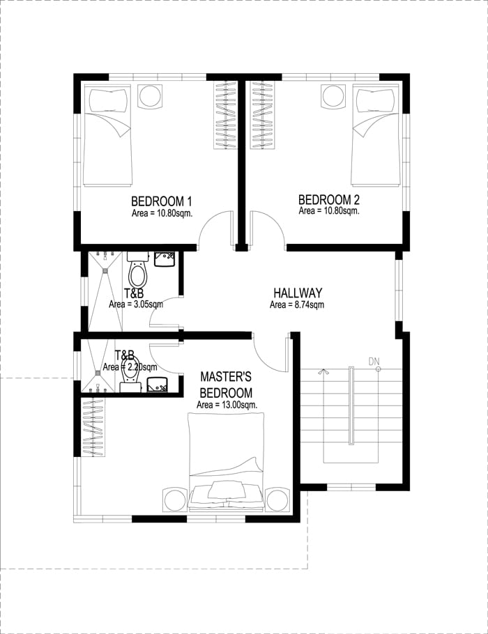 This design is a Two Story House with 4 bedrooms including the maid’s room. Ground floor is the space for family’s living room, dining with built-in bar, kitchen and maid’s room. Entering this house will lead you to the dining with bar and the living area. The second floor of this two story house plan consists of the master’s bedroom with bath and the 2 bedrooms sharing a common bath. The second floor master’s bedroom also features a corner picture window which adds to its modern house plan type.