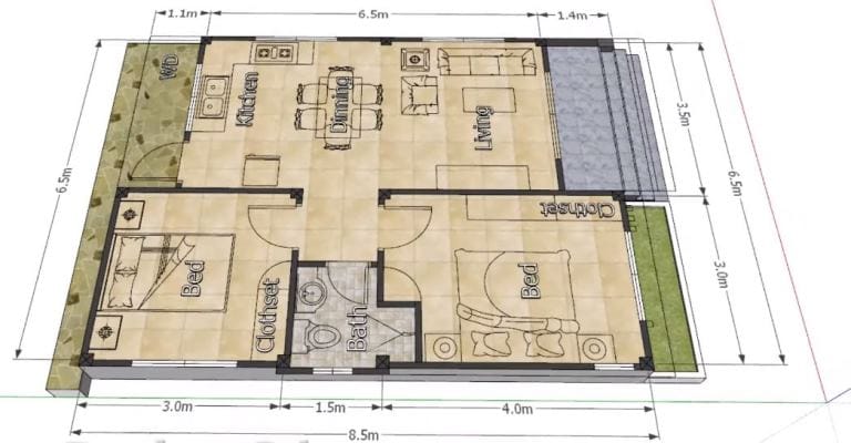 House plan concept today is a modern compact bungalow with two bedrooms. It actually measures 8.5 x 6.5 meters of that is 55.25 square meters. It was designed perfectly for a compact bungalow that employs minimalism.